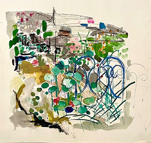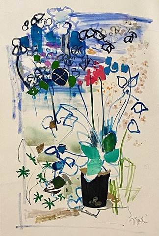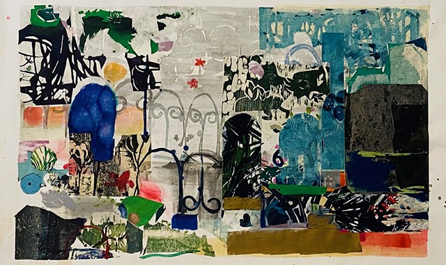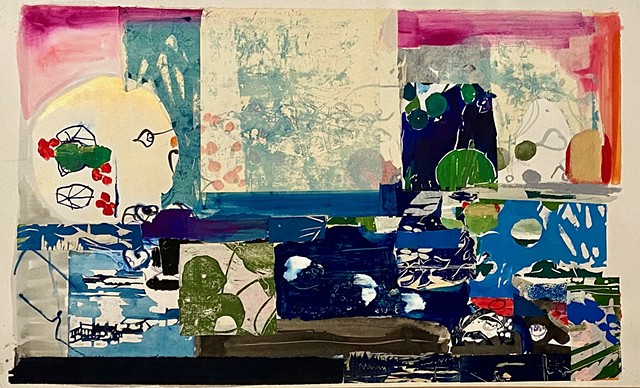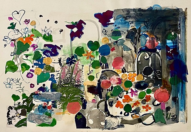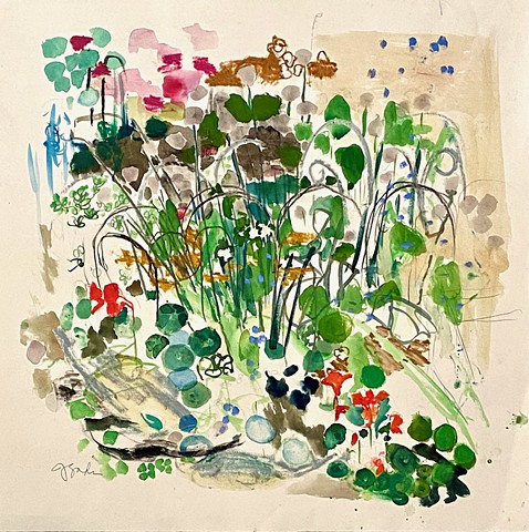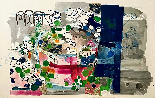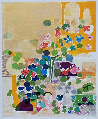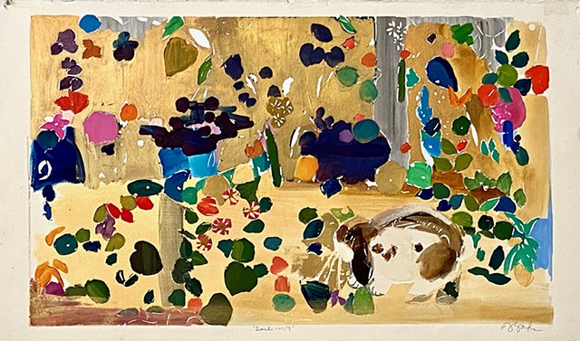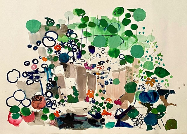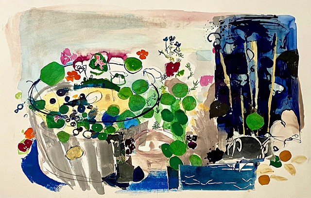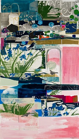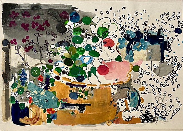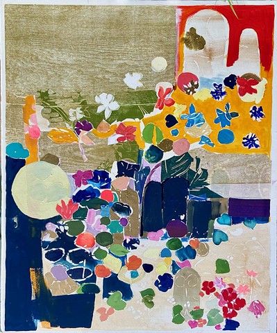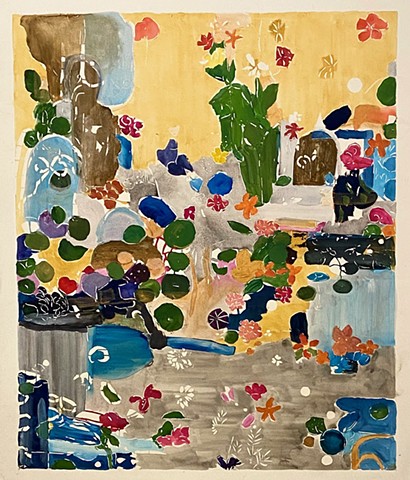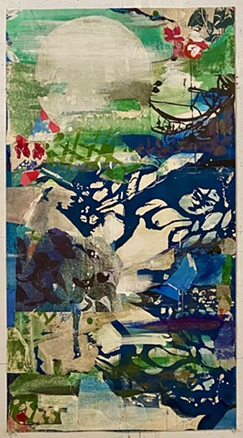 These paintings are produced using Japanese Stencil Dyeing or katazome. I cut a stencil out of mylar and spread a resist paste over it. Once the paste dries I can paint the piece. The paste is then soaked off, revealing the sections that were protected by the paste during the painting process.